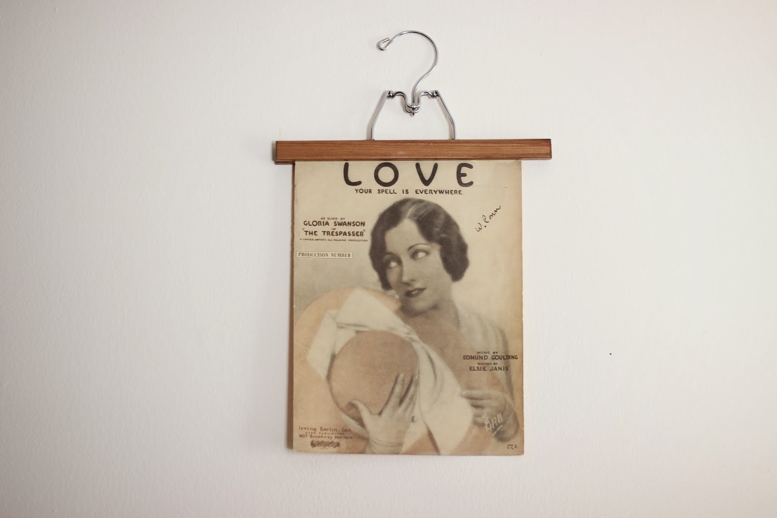 When I decorated my dressing room I decided to go for a something really girly by framing sheet music covers of beautifully illustrated women from the 1920s. Then, in the middle of the night the frames kept falling because the double sided adhesive strips I was using were not as sticky as I’d thought. I got tired of thinking I was hearing a gun shot go off every time one of the frames fell to the floor so instead opted for this awesome idea I found on Pinterest to display my vintage girls. I added wooden hangers to my thrift wish list and found them at none other than Givits for $1 a piece. I thought it would be appropriate to use the hangers in my dressing room but you could do this with any picture or art in any room. I absolutely loved this idea!