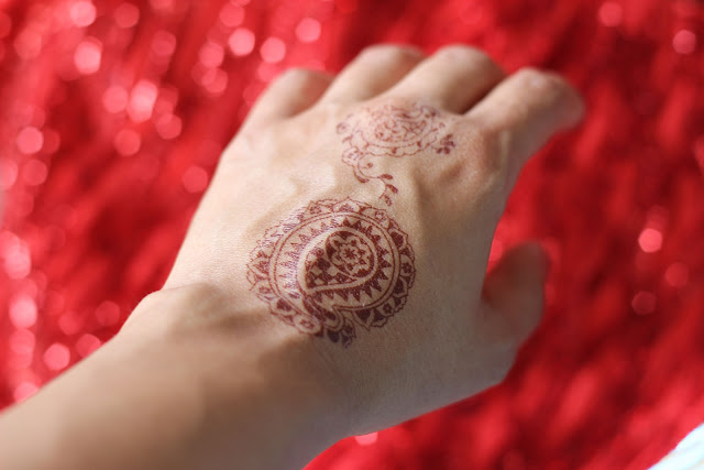 | {It was hard to see from the runway, but the models wore temporary henna on their hands} |