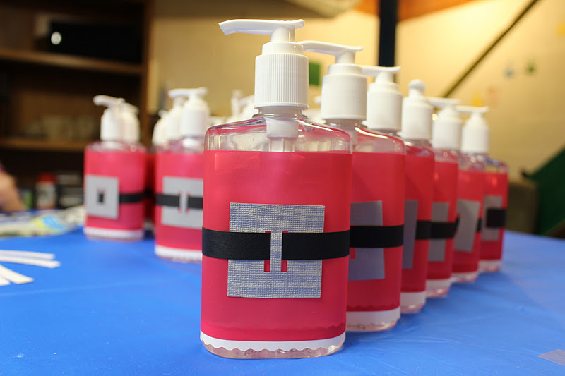 - Cut pieces of red table cloth into rectangles. Measure your first one based on your bottle of sanitizer.